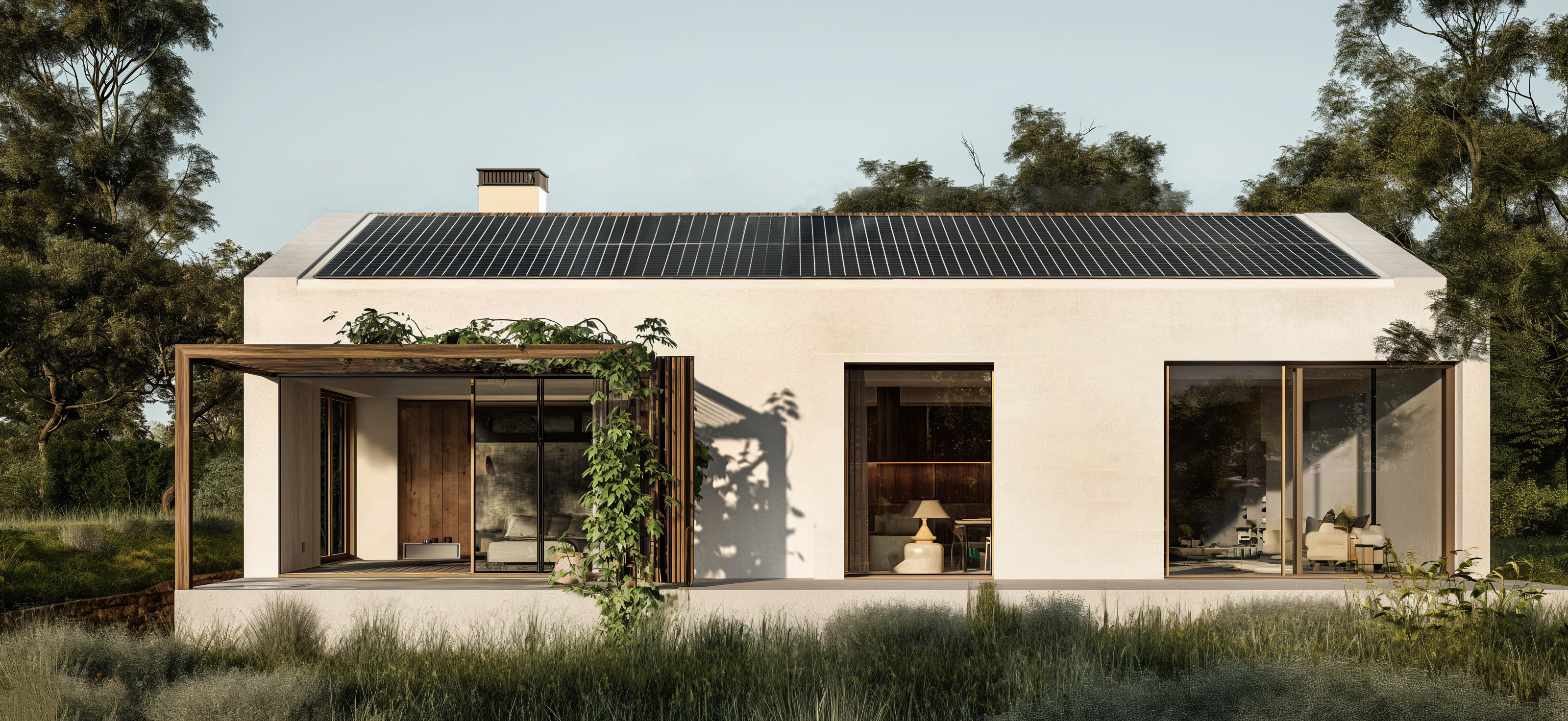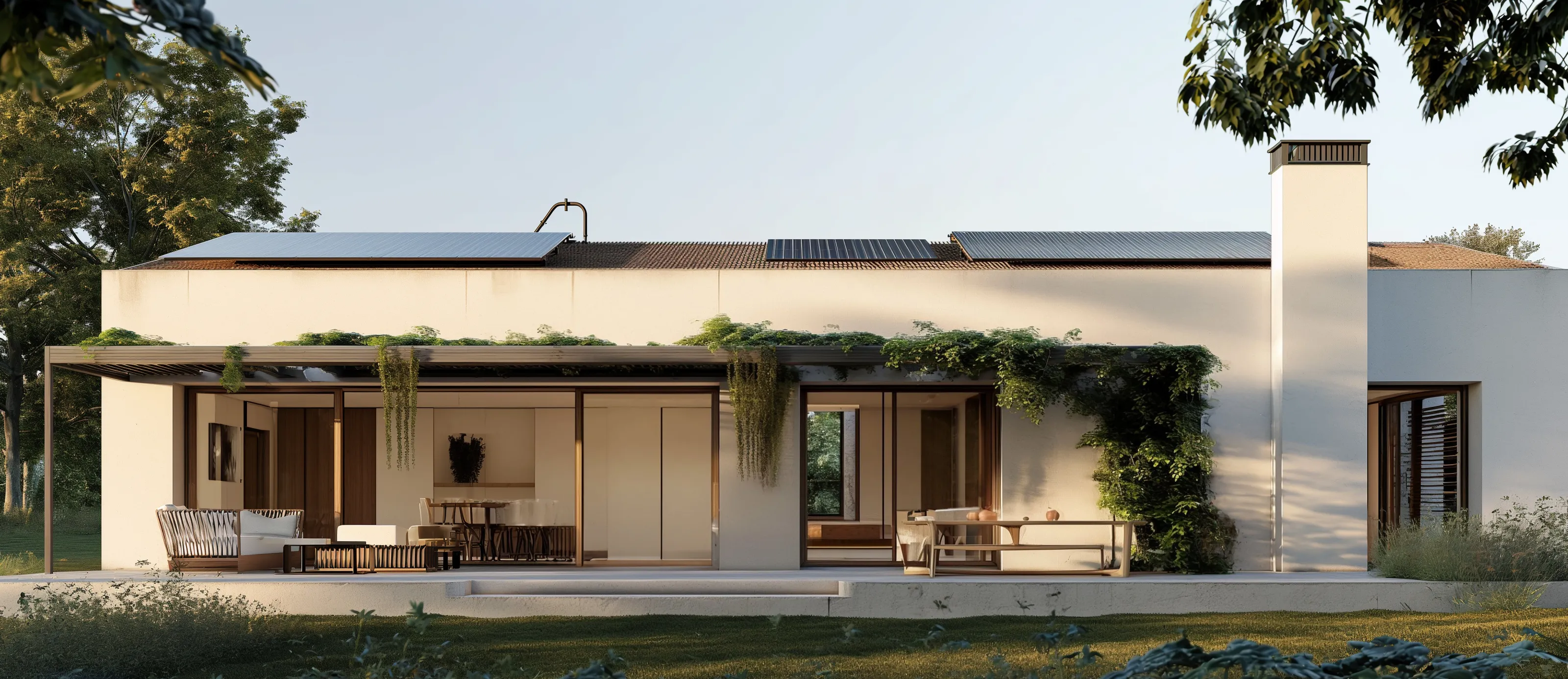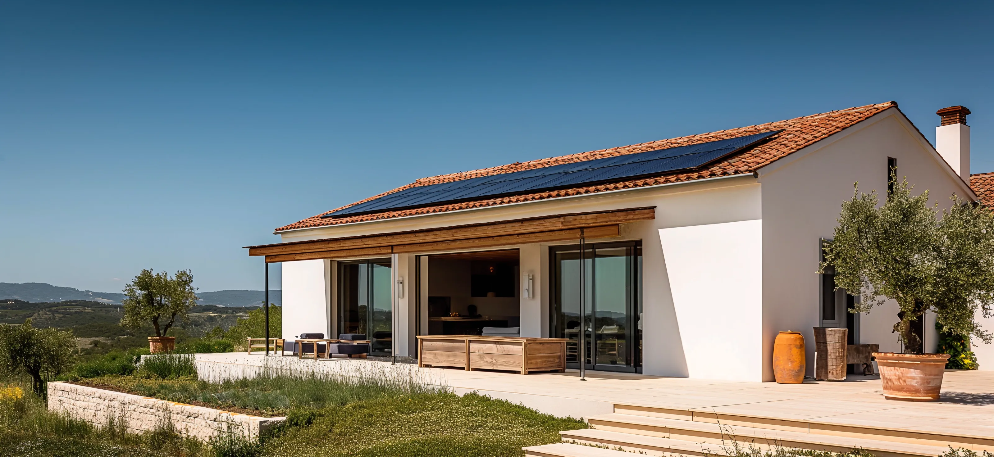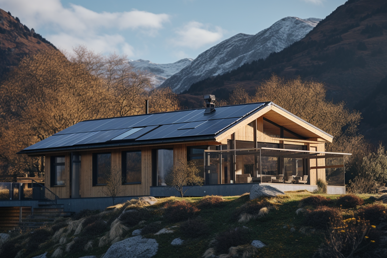 Вътрешността излъчва елегантност, с изложени дървени балки, създавайки усещане за топлина и роскош. Слънчевите панели захранват вашия устойчив начин на живот, а добре проектираното пространство гарантира, че всеки ъгъл има своя смисъл.
